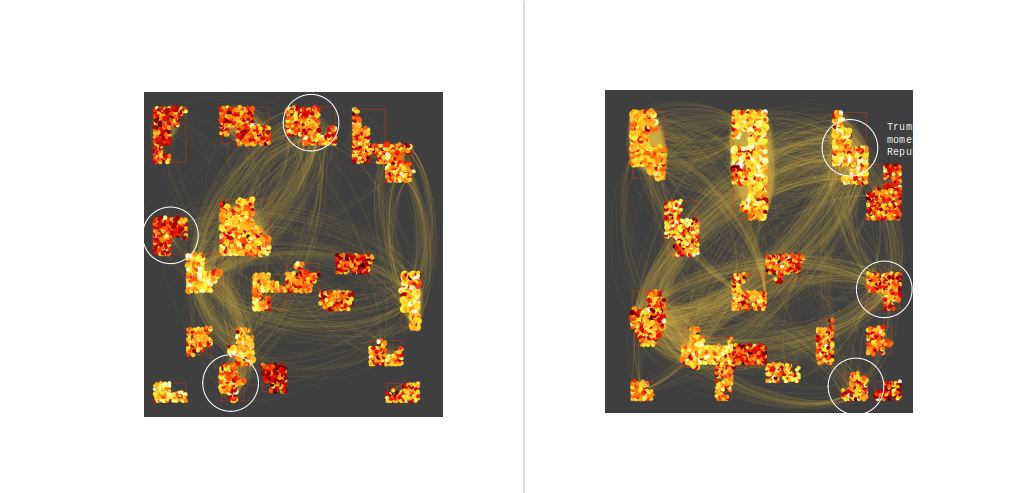As per our analysis, it is clear to see that Trump had much more exposure than other candidates (red squares against blue squares). Even in topics that do not concern him, news made a way of showing his controversial thoughts. Looking back now seems that this much exposure had served him well. Also, his violent discourse seemed to match the violent period in that year (green squares). We are not saying that by looking at our analysis one could infer the election results, but we tend to believe that 'Trump being elected' odds could be better than what the polls were showingยน. And sometimes just one day ahead, one extra percentage point it is all that matters.